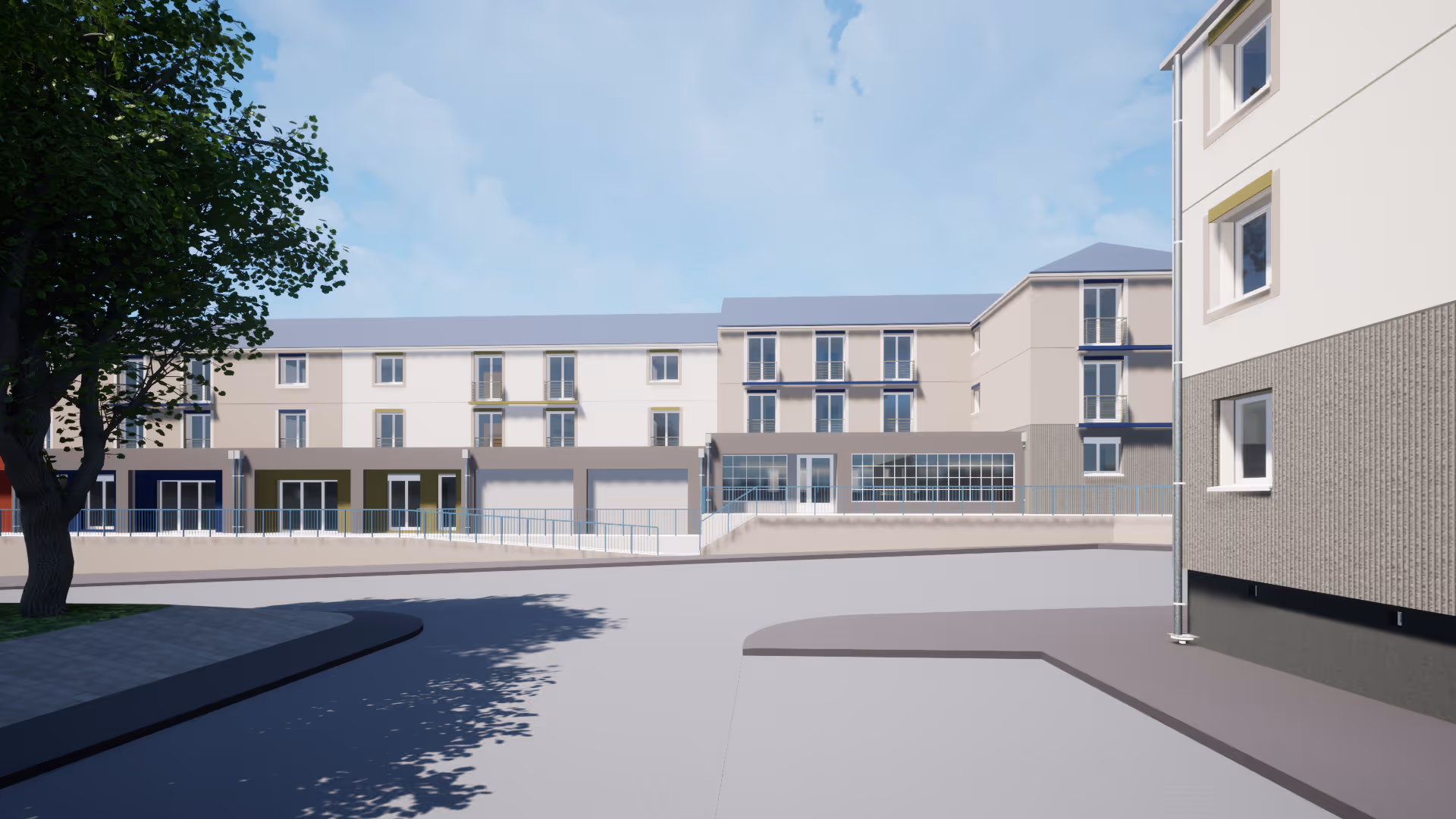 Création de marquises au-dessus des entrées : on sait enfin où rentrer, et on est protégé en attendant d'ouvrir sa porte. Les halls d'entrée sont réaménagés pour devenir de vrais espaces d'accueil – lumineux, propres, agréables. Remplacement des garde-corps vieillissants, mais conservation des balcons existants. Pas de démolition inutile : on change ce qui doit l'être, on garde ce qui fonctionne encore. Une approche pragmatique et économe. Rénovation des pièces humides – salles de bains et cuisines – pour améliorer le confort quotidien des habitants.
