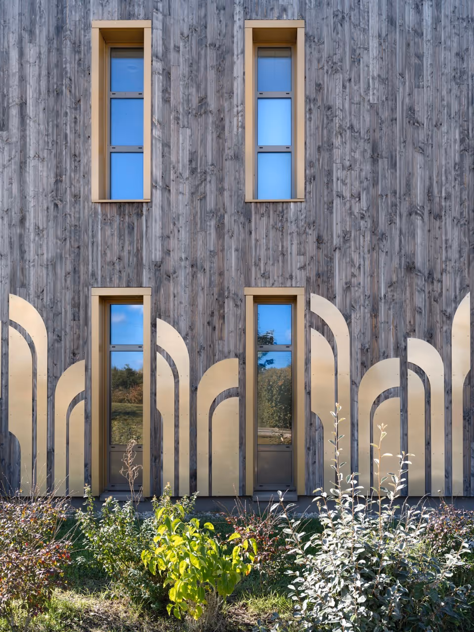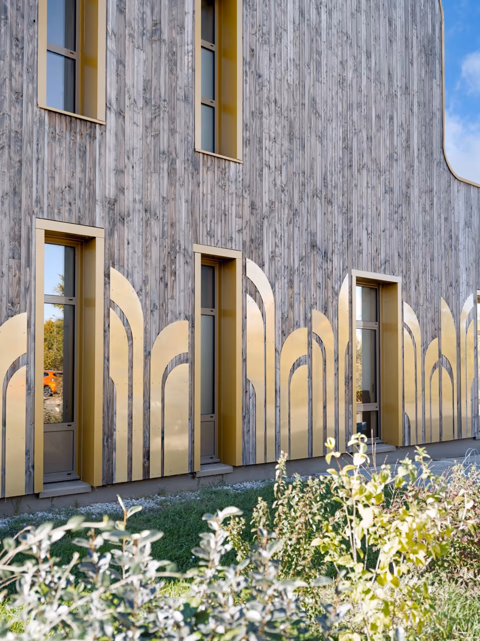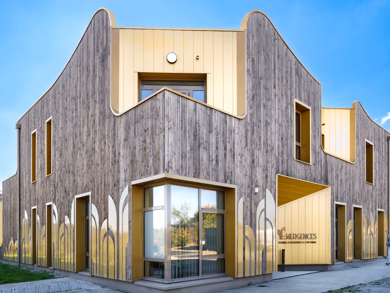 L’identité du bâtiment s’affirme à travers un jeu graphique inspiré de l’Art déco : des formes découpées en métal doré viennent ponctuer le bardage bois, offrant un visage accueillant et lumineux à l’entrée de la zone d’activité. Une touche joyeuse et raffinée pour un lieu d’innovation et de rencontre.