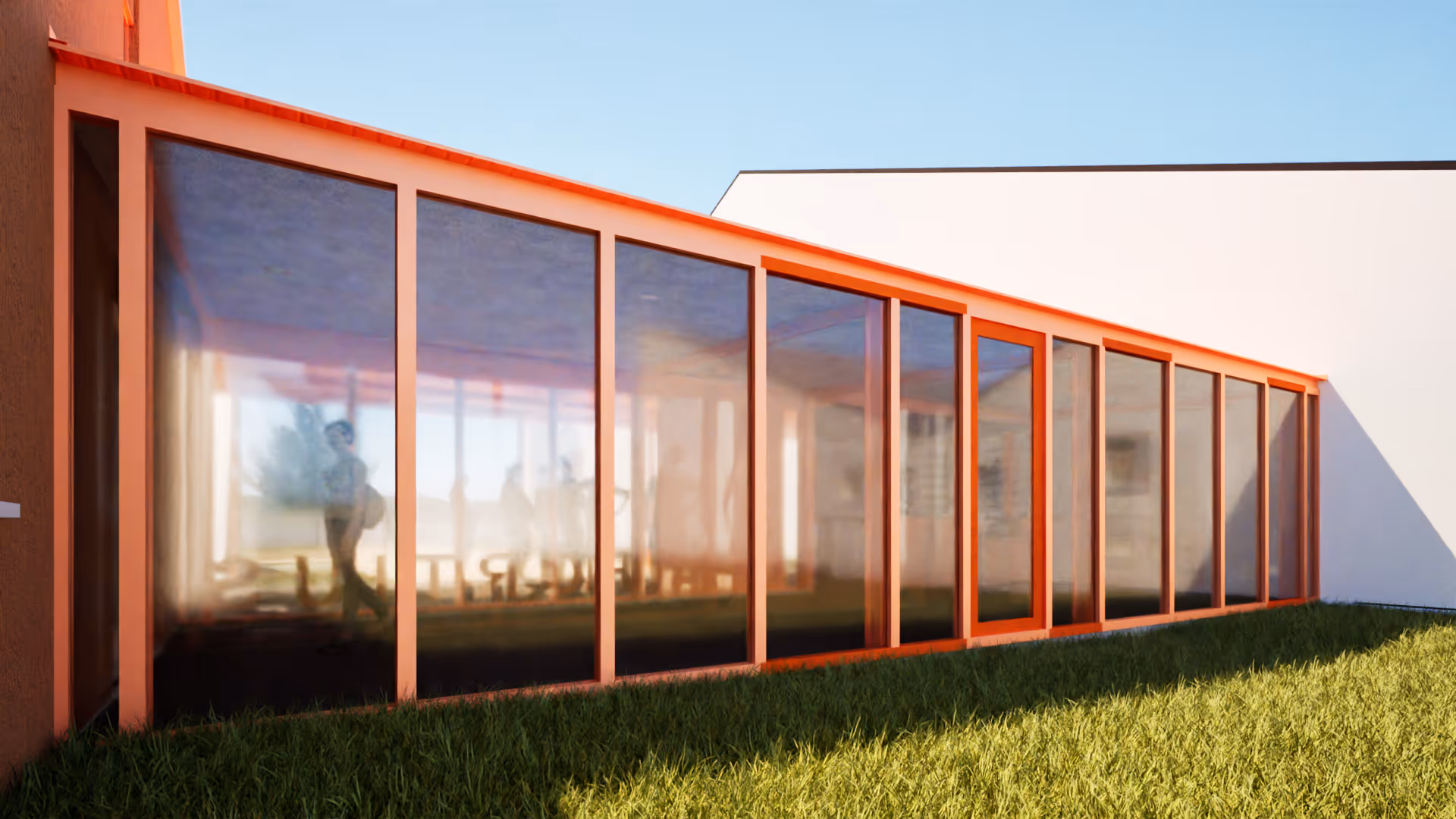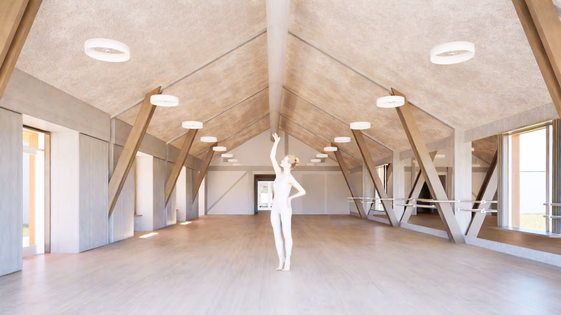 La nouvelle salle d'expression corporelle s'adosse au gymnase existant. Conçue comme une grande halle, elle peut s'ouvrir intégralement sur l'extérieur grâce à ses menuiseries accordéon. Par beau temps, il sera possible de danser dehors – une fluidité rare entre intérieur et extérieur. Le bâtiment est en charpente bois et en murs de briques de chanvre, matériaux qui respirent et régulent naturellement l'hygrométrie.