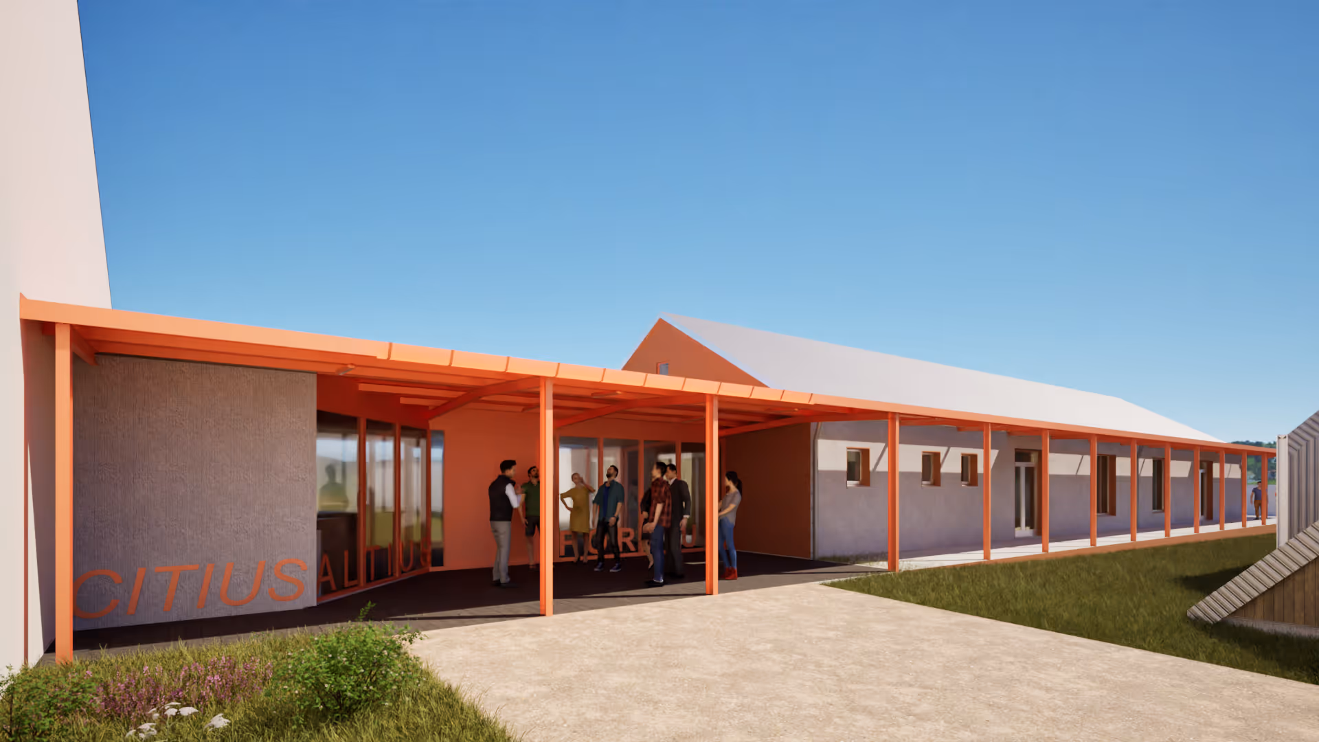 L'espace laissé entre la nouvelle salle et le gymnase existant ne reste pas vide : il devient un lieu d'accueil pour les événements. Un parvis, un seuil, un lieu de respiration entre deux volumes, l'architecture se joue aussi dans les vides.
