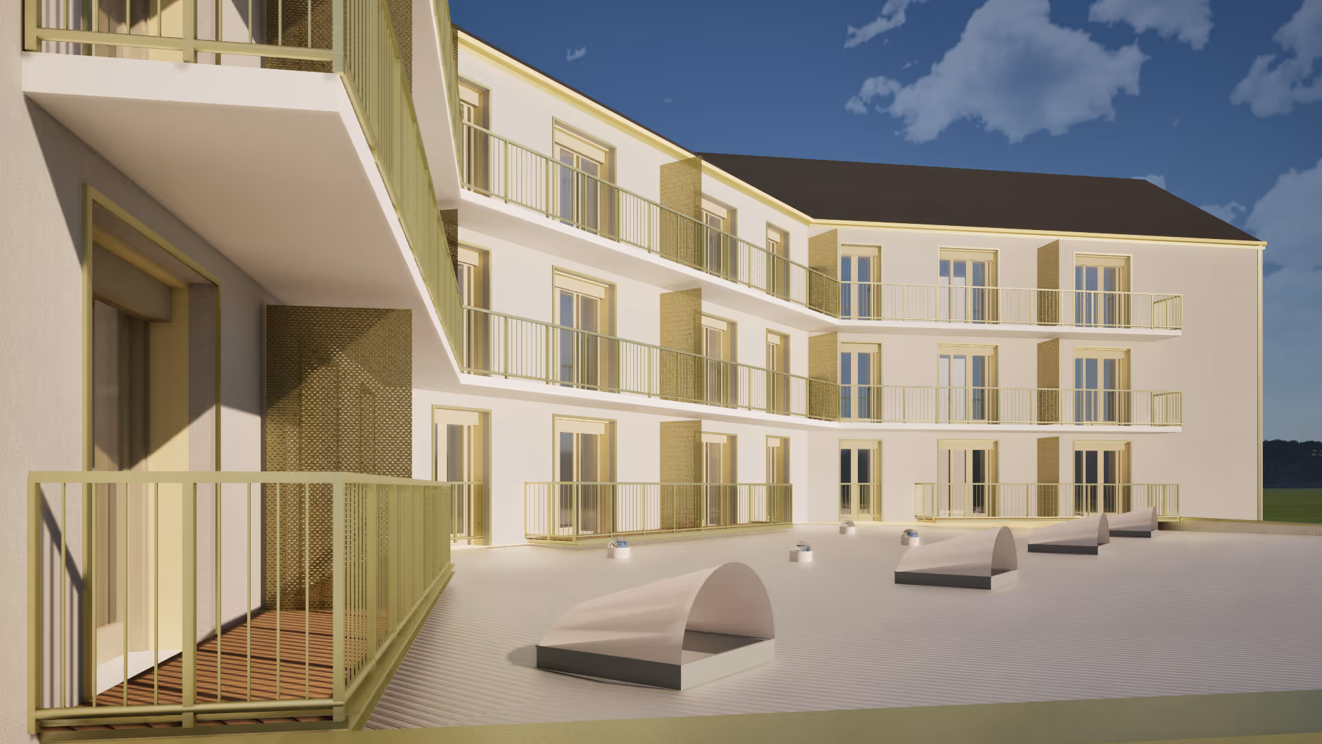Sur la dernière résidence, même logique d'isolation par l'extérieur en laine de bois. Mais ici, l'enjeu est de valoriser les logements sous combles, souvent peu attrayants. Des terrasses tropéziennes sont créées au dernier étage, transformant ces espaces contraints en appartements lumineux avec vue. Des terrasses sont également créées pour les logements en rez-de-jardin - chacun son morceau de ciel.