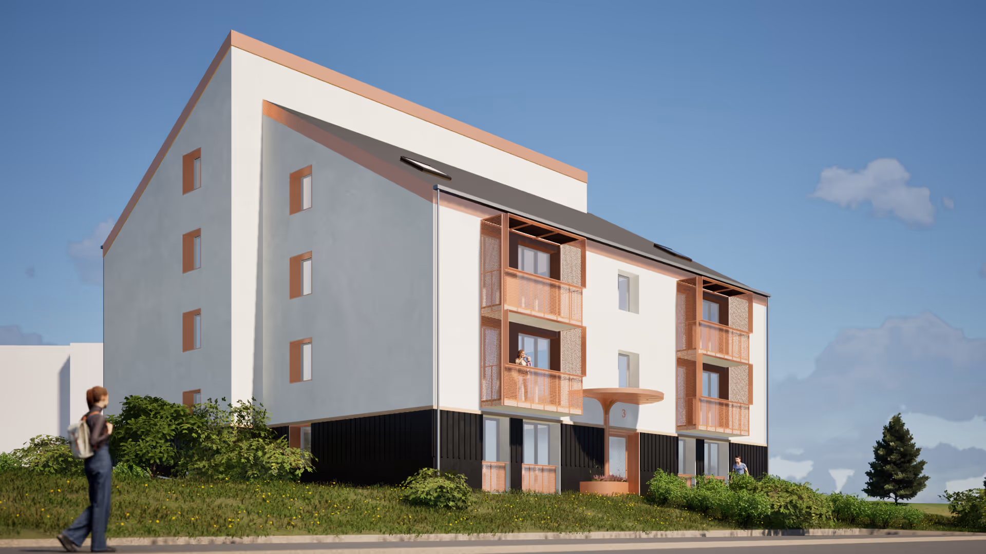 Isolation par l'extérieur de 48 logements. Mais au lieu de se contenter d'un simple ravalement technique, le projet fait le pari de transformer radicalement l'image et l'usage de la résidence. Isoler, c'est aussi l'occasion de réinventer. Isolation en laine de bois, bardage en bois brûlé : les matériaux détonnent avec ce qu'on voit habituellement dans les rénovations de logements sociaux. Le bois brûlé apporte cette profondeur, ce noir mat qui change tout - et qui vieillit magnifiquement bien. Nouveau auvent couleur cuivrée : surprenant et joyeux. Un choix audacieux qui vient ponctuer la façade d'une touche lumineuse, presque précieuse. Parce qu'un projet de rénovation sociale mérite aussi ses moments de folie assumée. Un avant/après radical qui prouve qu'on peut faire du beau avec du technique.