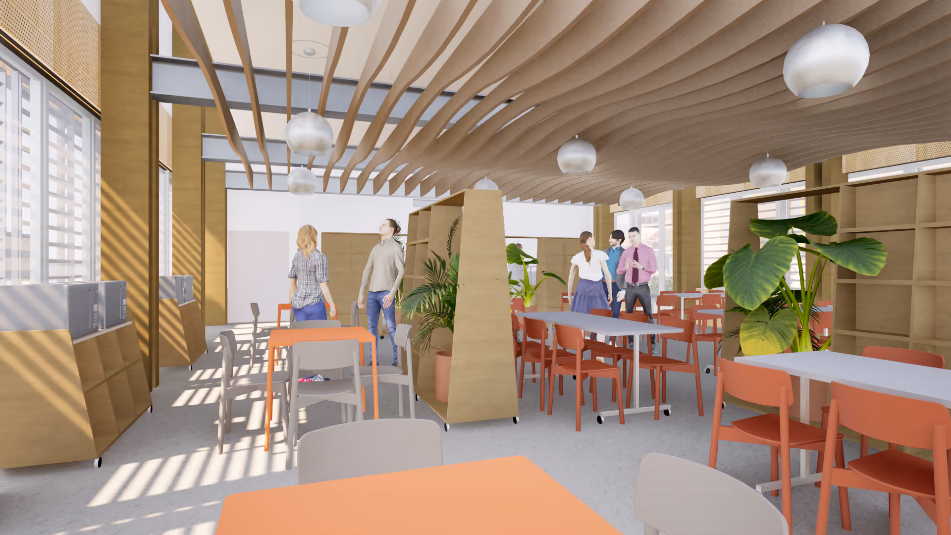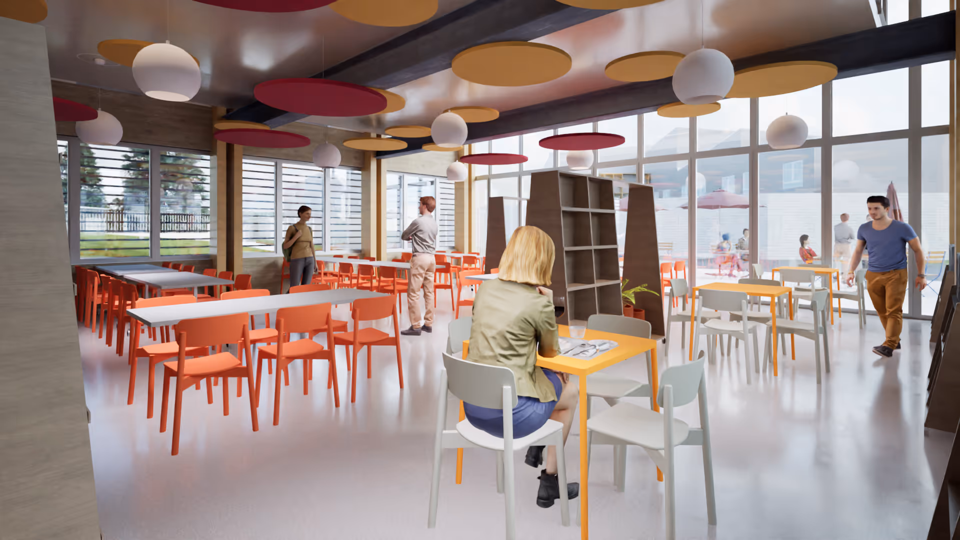 Le bâtiment principal s'élève en ossature bois, avec des formes simples et un jeu de transparences assumé. Les regards traversent, la lumière circule. Pas de grandiloquence architecturale : juste l'essentiel pour que la vie étudiante prenne toute la place qu'elle mérite.