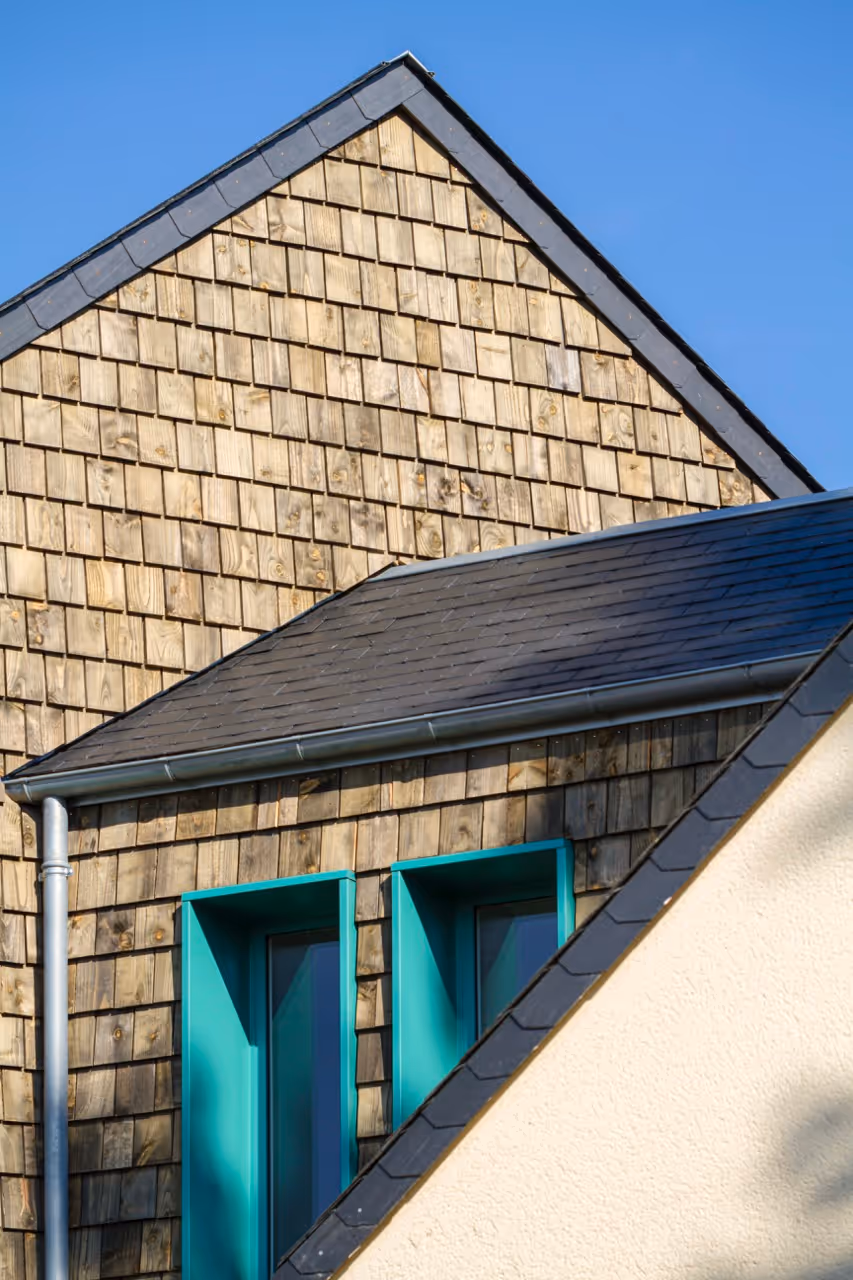 Pour préserver le jardin en rez-de-chaussée, l’extension s’élève partiellement à l’étage. Sur le bardage en tavaillons, des nichoirs à oiseaux viennent ponctuer la façade, rappelant le lien entre soin, nature et attention. Le projet fait du végétal un acteur essentiel du bien-être thérapeutique.