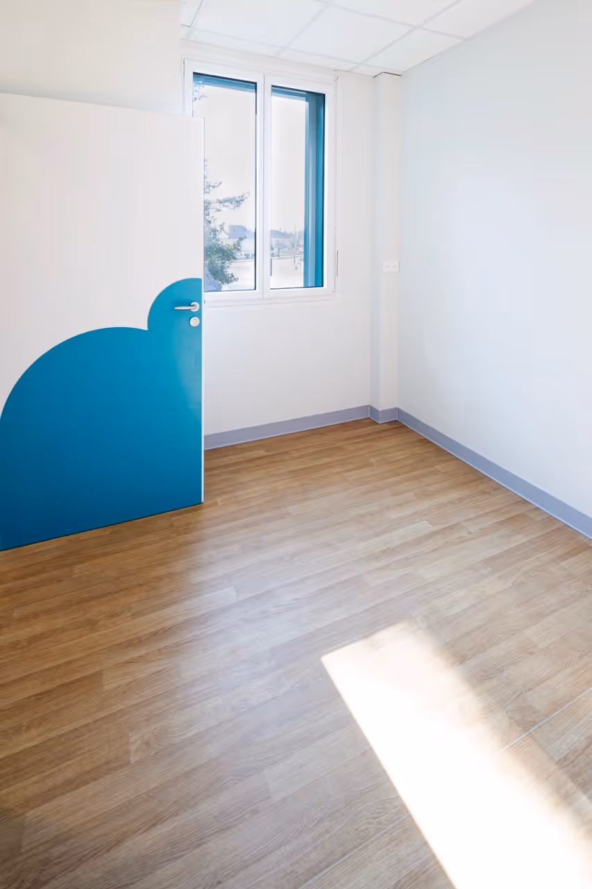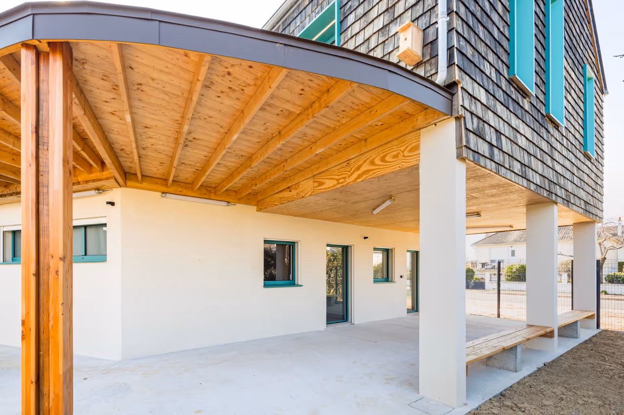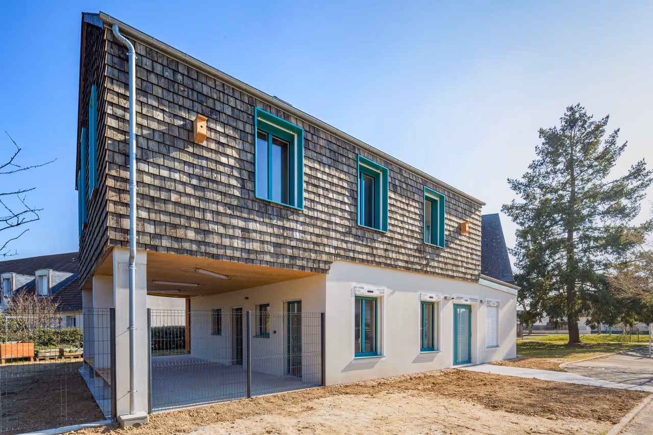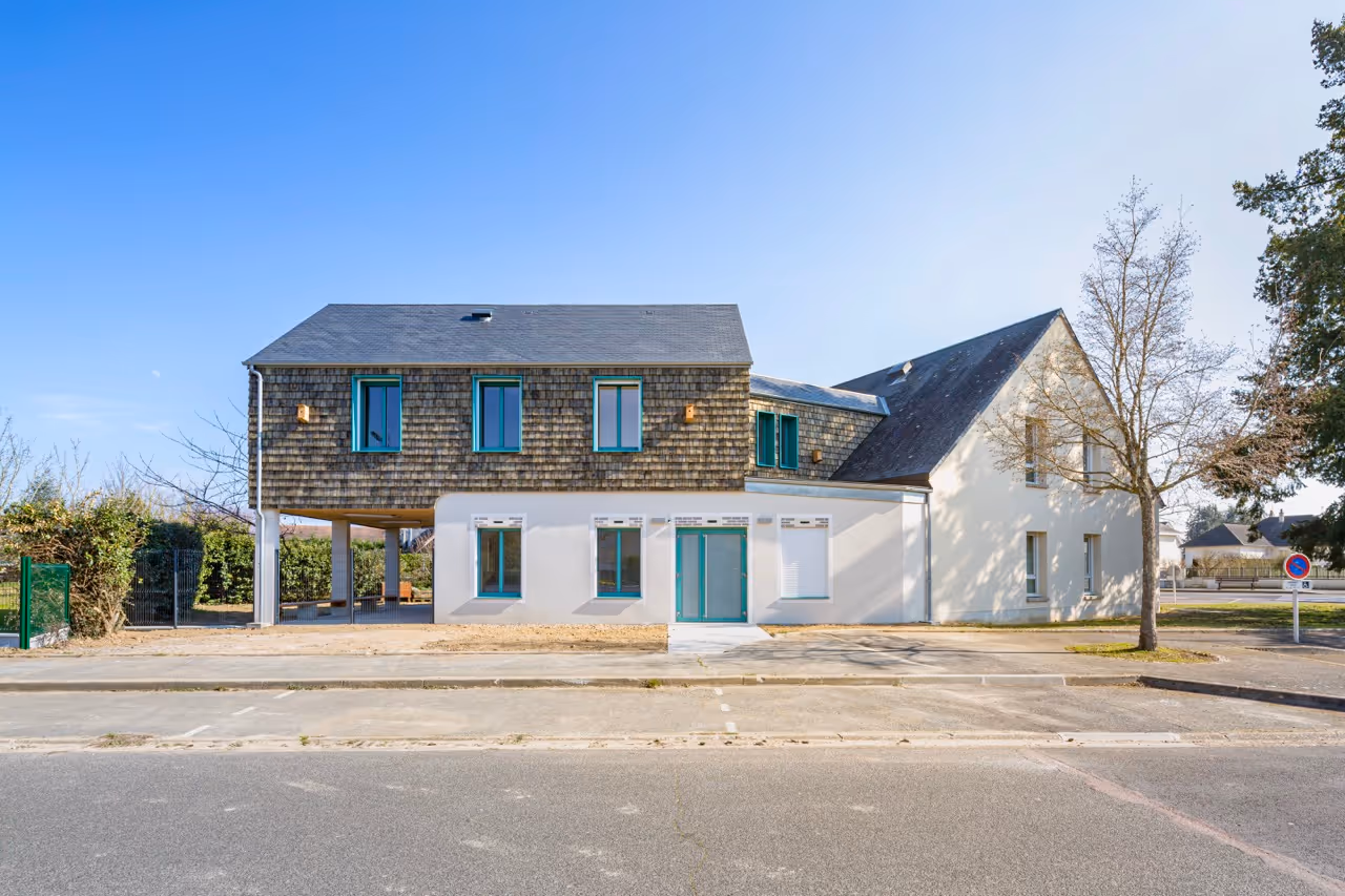 En périphérie de Blois dans un quartier pavillonnaire,le projet prolonge le centre thérapeutique existant pour accueillir les jeunes en difficultés dans un environnement serein. L’architecture se veut présente sans s’imposer, rassurante sans paraître respectueuse de la fragilité des usagers. Le centre devient une cabane douce et protectrice accrochée au bâtiment attenant et habillé d’un bardage bois aux teintes joyeuses et apaisantes.
